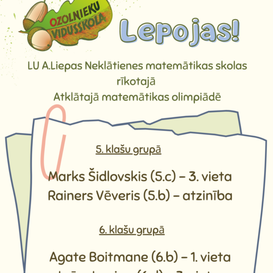 Kā jau katru gadu, arī šajā mūsu skolas 5. – 9. klašu skolēni piedalījās LU A.Liepas Neklātienes matemātikas skolas organizētajā 2022./2023. m.g Atklātajā matemātikas olimpiādē. Ļoti lepojamies par katru skolēnu, kurš papildus ikdienas mācību darbam vēlas sevi pilnveidot un izaicināt, piedaloties viktorīnās, konkursos un olimpiādēs!