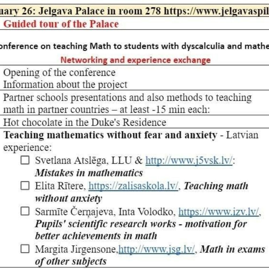 2023. gada 26. janvārī SIA Izglītības atbalsta birojs Jelgavas pilī rīkoja starptautisku tīklošanās un pieredzes apmaiņas konferenci “Matemātikas apguve bez bailēm un satraukuma”, kas notika Erasmus+ Stratēģiskās partnerības projekta ietvaros.
