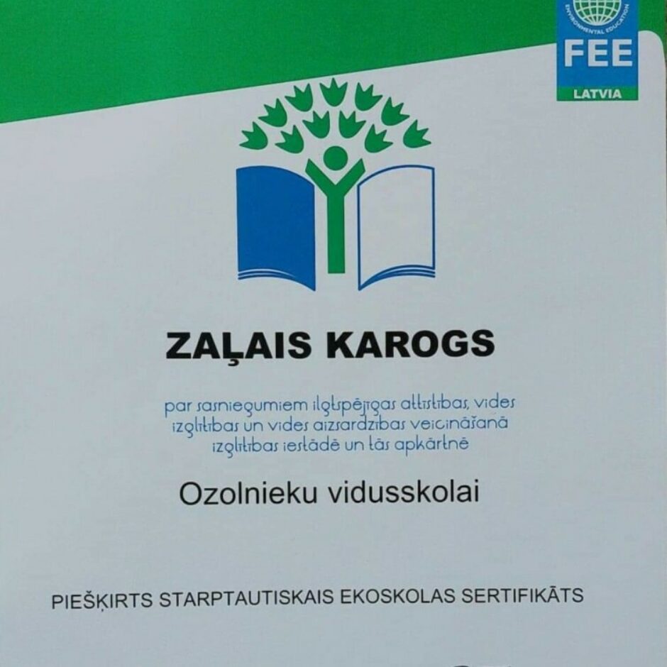 Šogad 96 izglītības iestādes saņēma prestižo starptautisko Zaļo karogu, tostarp piecām izglītības iestādēm tika piešķirts augstākais programmas apbalvojums Ekoskolu vēstnieka statuss, 43 – ieguva Latvijas Ekoskolas sertifikātu. Lepojamies, ka arī Ozolnieku vidusskolai šogad piešķirts starptautiskais Zaļais karogs, nu jau 7. gadu pēc kārtas. Skola Ekoskolu programmā darbojas 8. gadus.