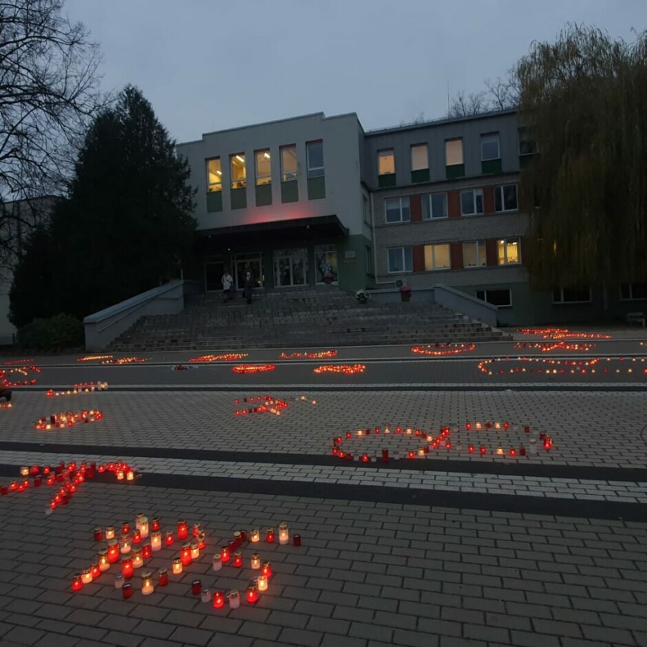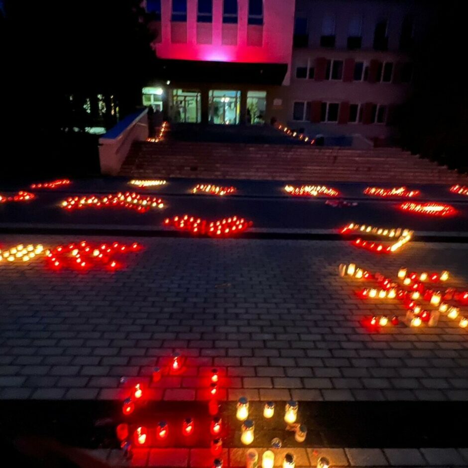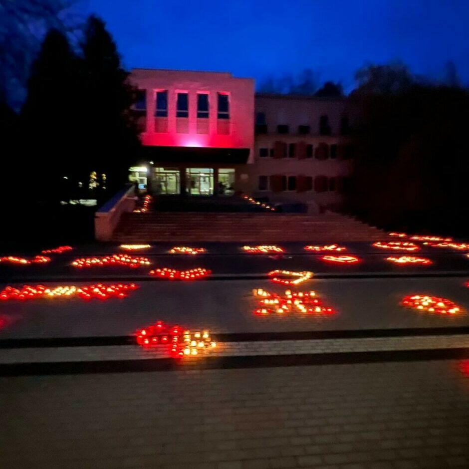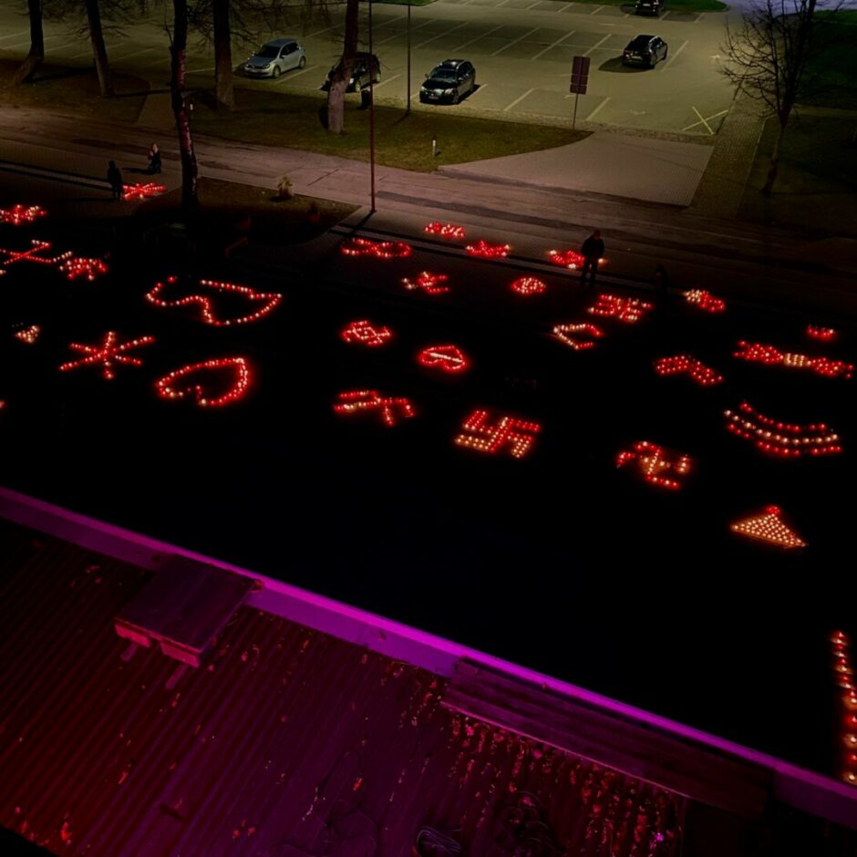 Latvijas proklamēšanas gadadienas svētku tradīcija Ozolnieku vidusskolā – Latvju rakstu, ornamentu veidošana no svecēm skolas priekšā
