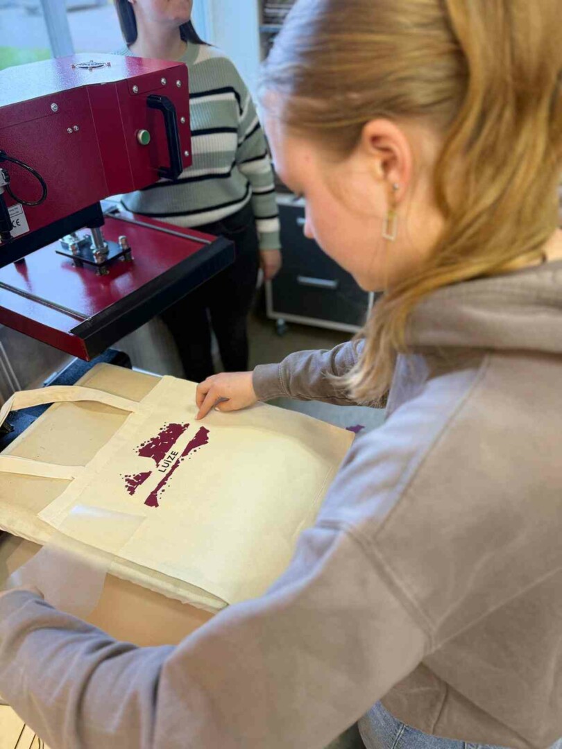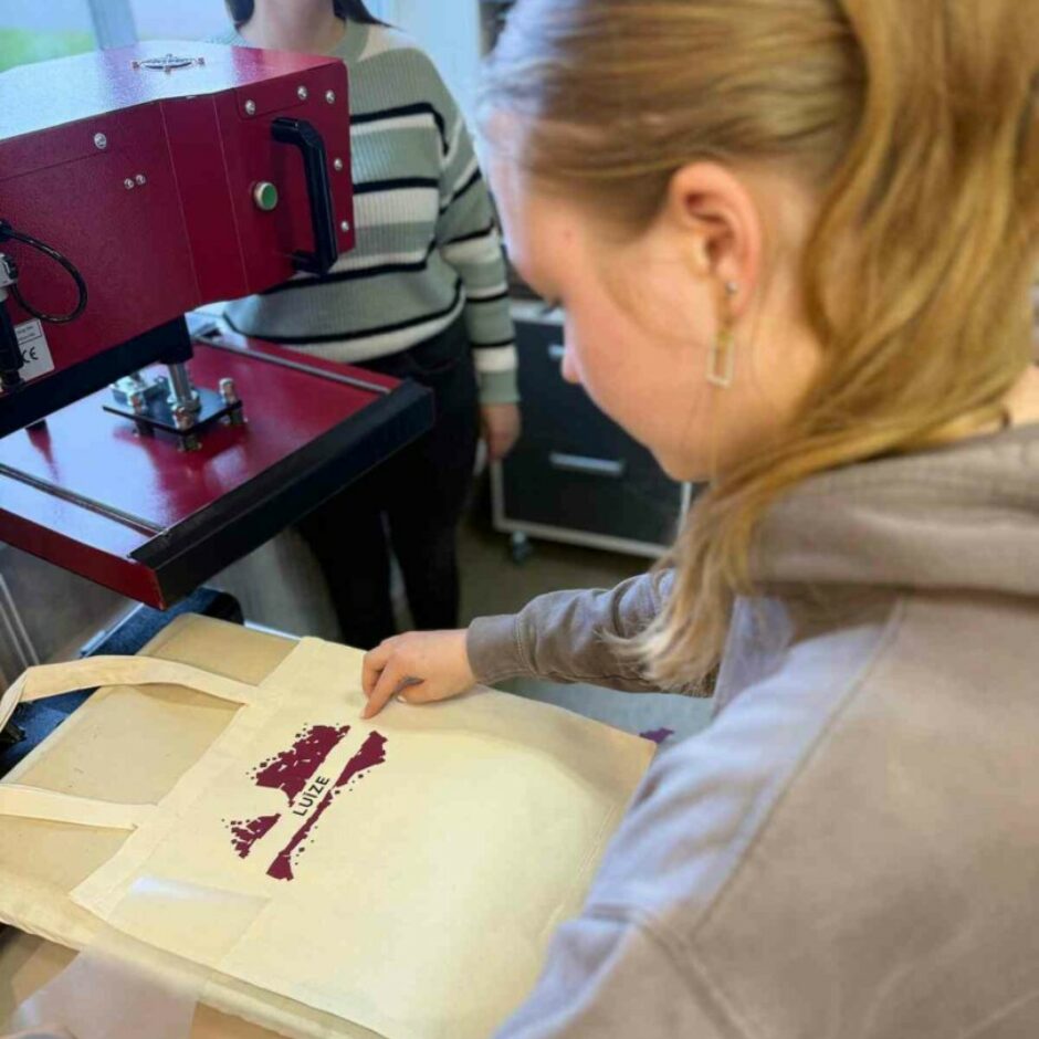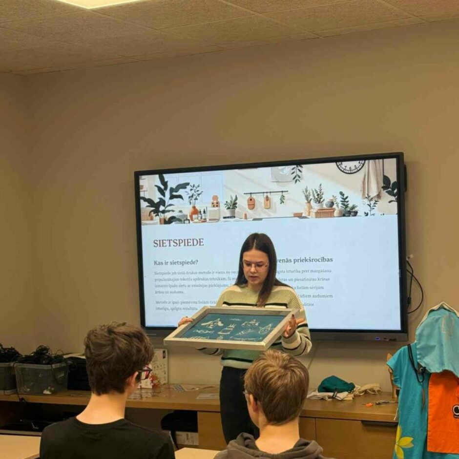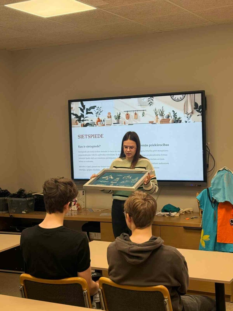 Praktiskajā daļā skolēni eksperimentēja ar materiāliem, modelēja un īstenoja savu radošo ideju – izveidojot oriģinālas auduma somiņas ar apdruku. Katrs somas dizainu papildināja ar Latvijas kartes kontūru un savu vārdu, tādējādi godinot Lāčplēša dienu un pieminot Latvijas brīvības cīnītājus. Šī nodarbība veicināja radošumu, sadarbību un domāšanu par ilgtspējīgu nākotni. Skolēni radīja jauna modes produkta risinājumu, izmantojot atkārtoti vai pārstrādājot lietotus materiālus, tādējādi dodot lietām otru dzīvi.