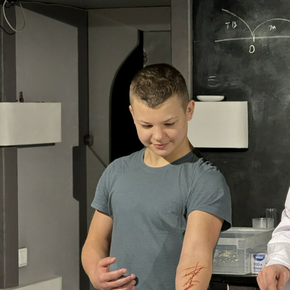 Nodarbībā par pamatu ņemta Latvijas filma “Dvēseļu putenis”, skolēniem tika rādīs, kas nepieciešams, lai radītu ticamus efektus un pēc iespējas precīzāk attēlotu filmā redzamos notikumus. Skolēni uzzināja, kā gatavo mākslīgās asinis, speciālus degošos šķidrumus, kā dažādu darbību veikšanai trenējas kaskadieri utt. Skolēniem bija iespēja arī pašiem izmēģināt visus specefektus, iesaistīties un piedzīvot to, ar ko savā ikdienas darbā saskaras teātra aktieri, lai jebkuru izrādi padarītu ticamāku.