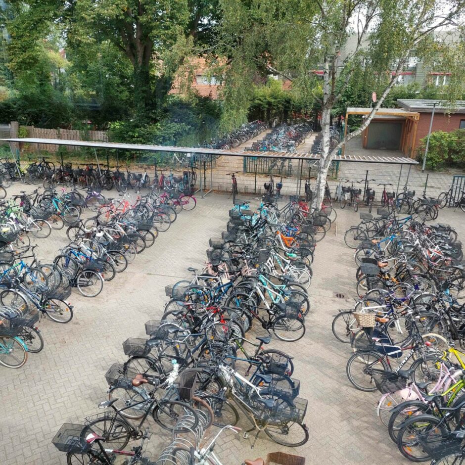 Pārsteidzoši liela daļa skolēnu un darbinieku uz skolu dodas ar velosipēdiem, tādēļ rīta pusē pirms stundām vērojamas lielas velobraucēju straumes, un brīžiem nejaušam kājāmgājējam pat jāuzmanās nepagadīties veselību veicinošā transportlīdzekļa ceļā.