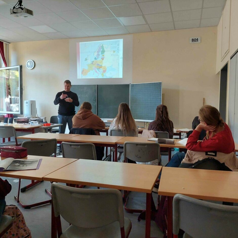 Max-Planck ģimnāzijā vairāki mācību priekšmeti, kā, piemēram, politika un vēsture, tiek mācīti bilingvāli. Tas pavēra iespēju mūsu kolēģim vēstures skolotājam Dāvim Strupulim novadīt vecāko klašu skolēniem divas mācību stundas, stāstot par Latviju, tās vēsturi un vietu Eiropas Savienībā. Stāstījums jauniešus ieinteresēja, par ko liecināja viņu uzdotie papildjautājumi un nodarbības beigās izteiktā vēlme, dzirdēt kādu teikumu latviešu valodā. Pēc Dāvja Strupuļa uzstāšanās atskanēja Vācijas skolēnu klauvējieni pa skolas soliem, kas ir pateicības un uzslavas apliecinājums.