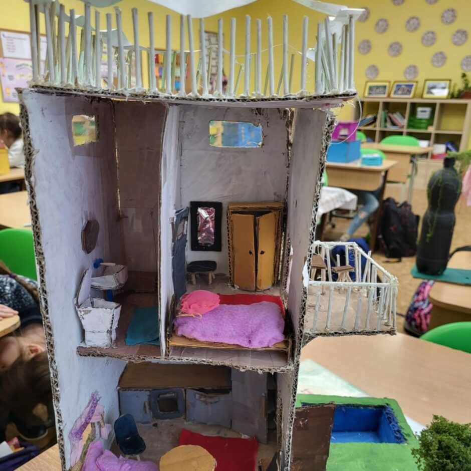Pēc tam veidoja mājas maketu no otrreiz lietojamiem materiāliem konkrētam iemītniekam. Skolēni ar prieku novērtēja savu paveikto darbu!